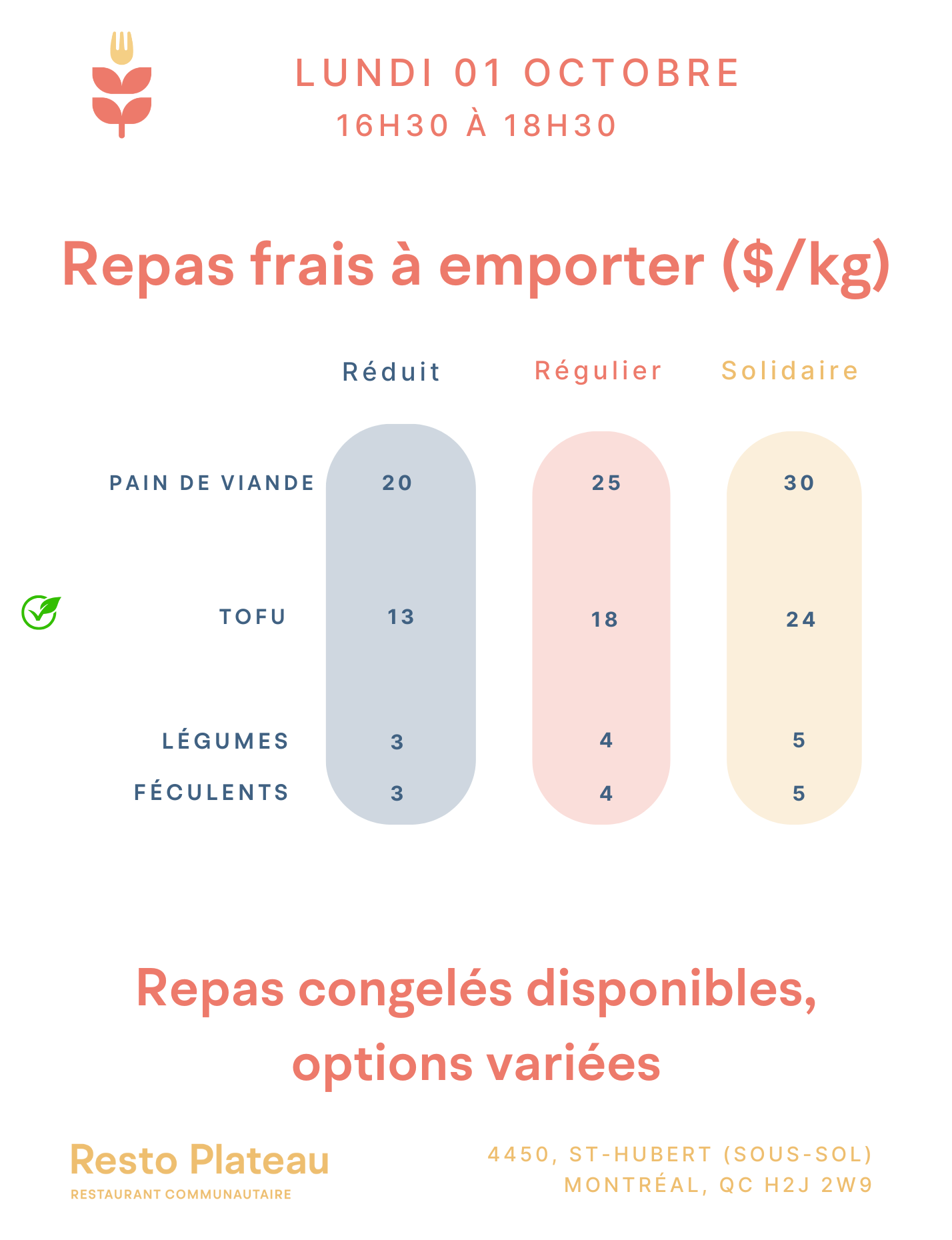Le prix solidaire à Resto Plateau est destiné à ceux et celles qui peuvent se permettre de payer un peu plus pour nos plats et qui souhaitent soutenir notre mission de renforcer la sécurité alimentaire des membres de notre communauté.
