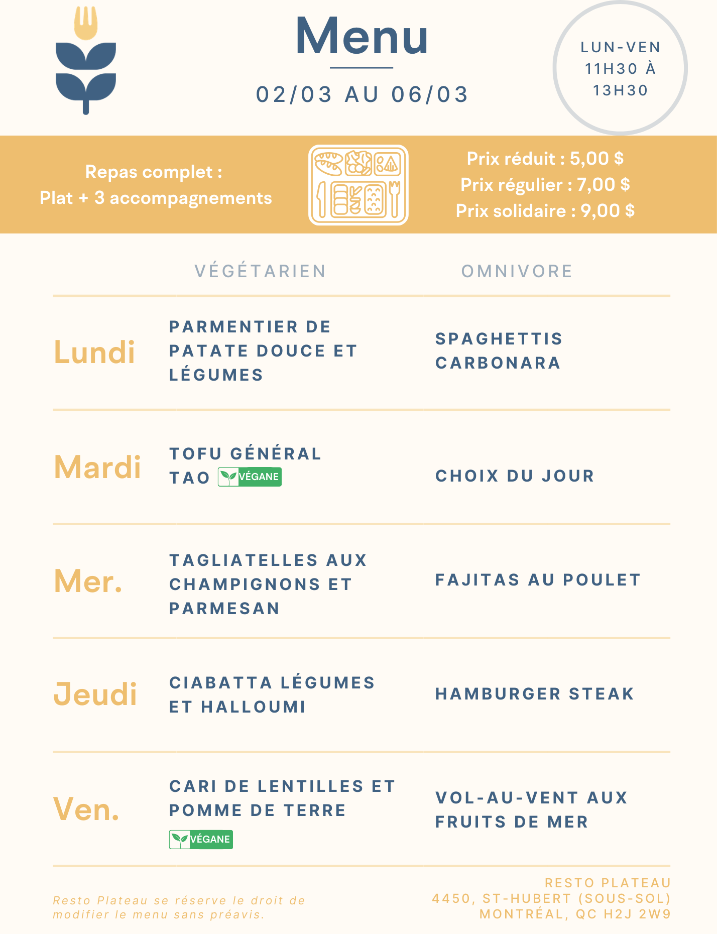 - Choice of dessert (fruit, yogurt, homemade cake…)