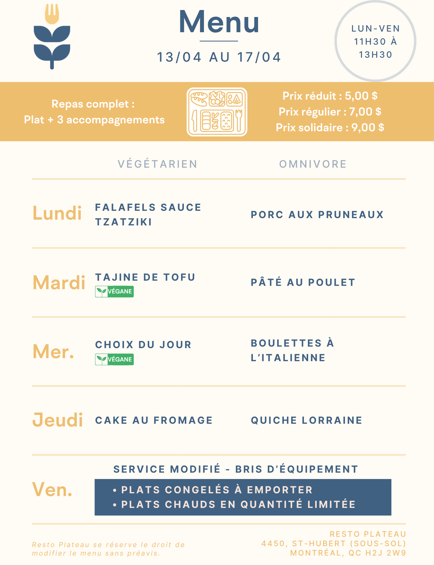 - Choice of dessert (fruit, yogurt, homemade cake…)